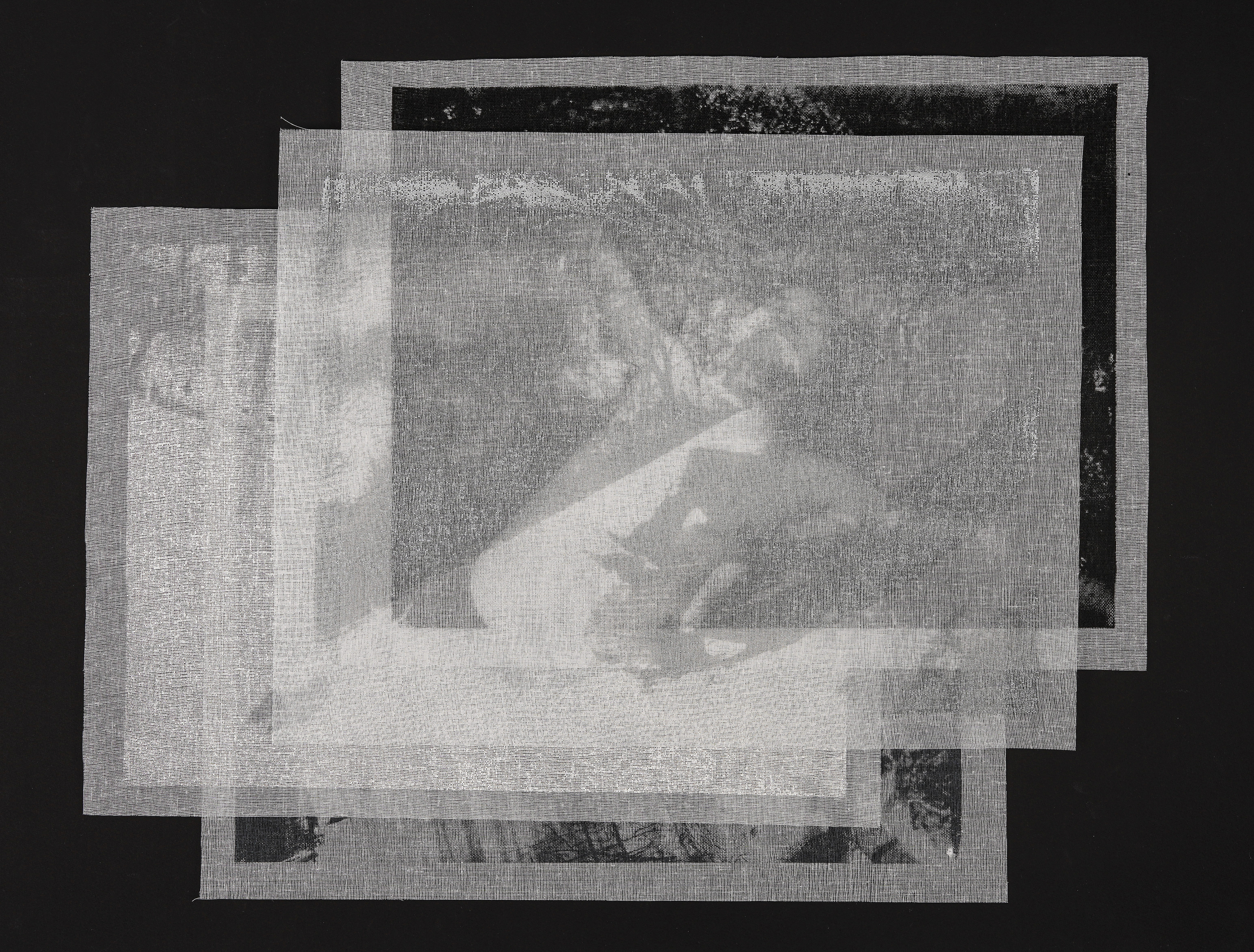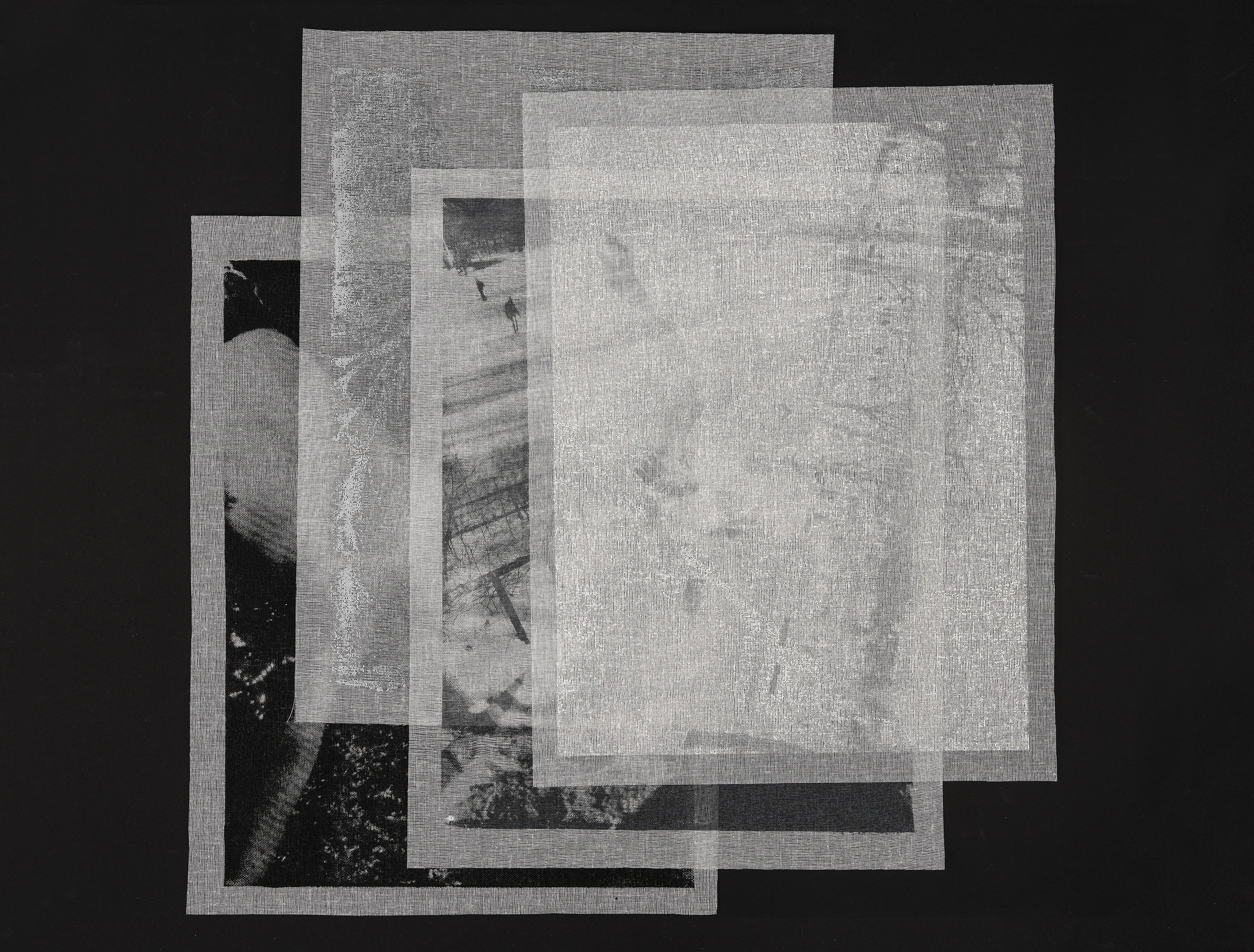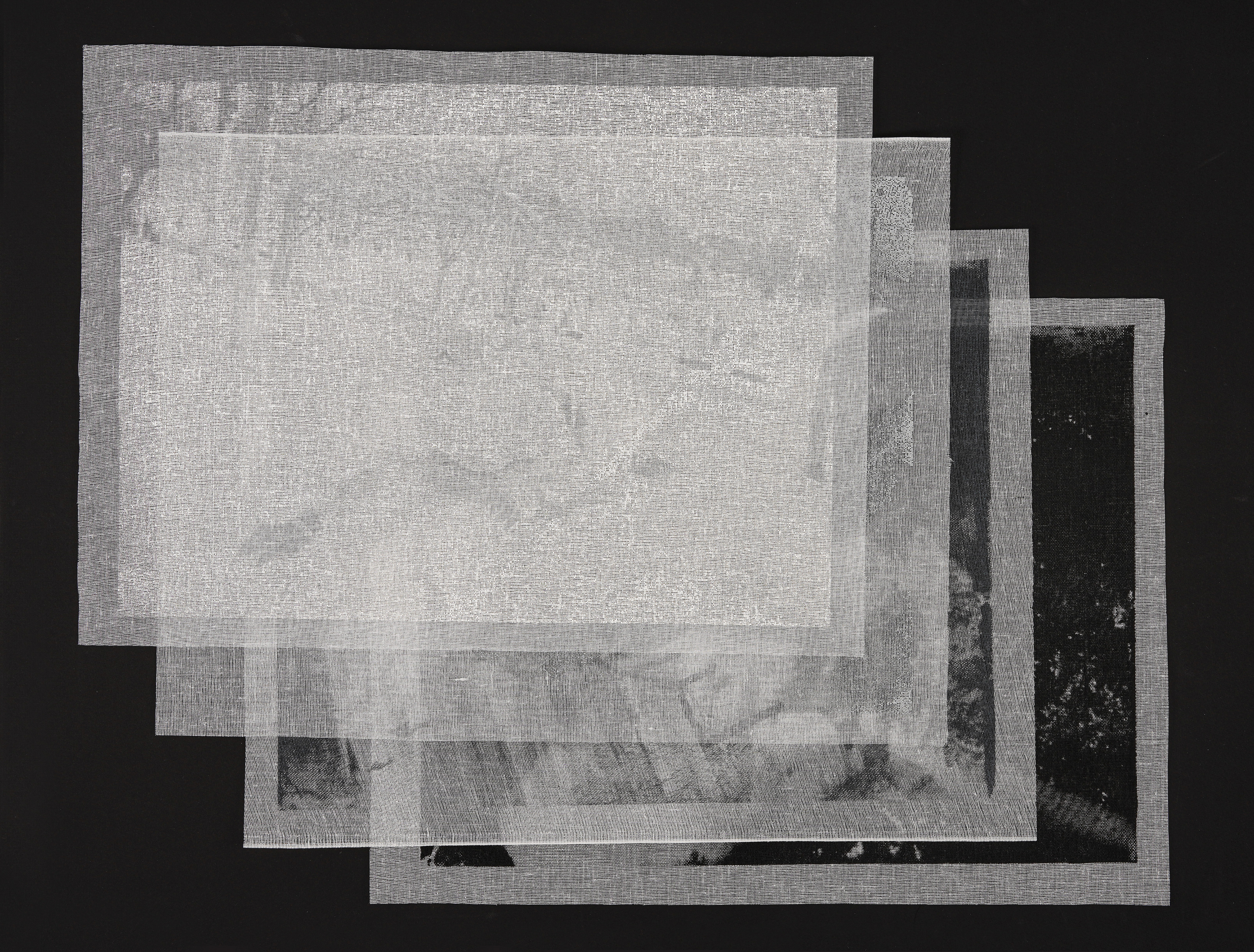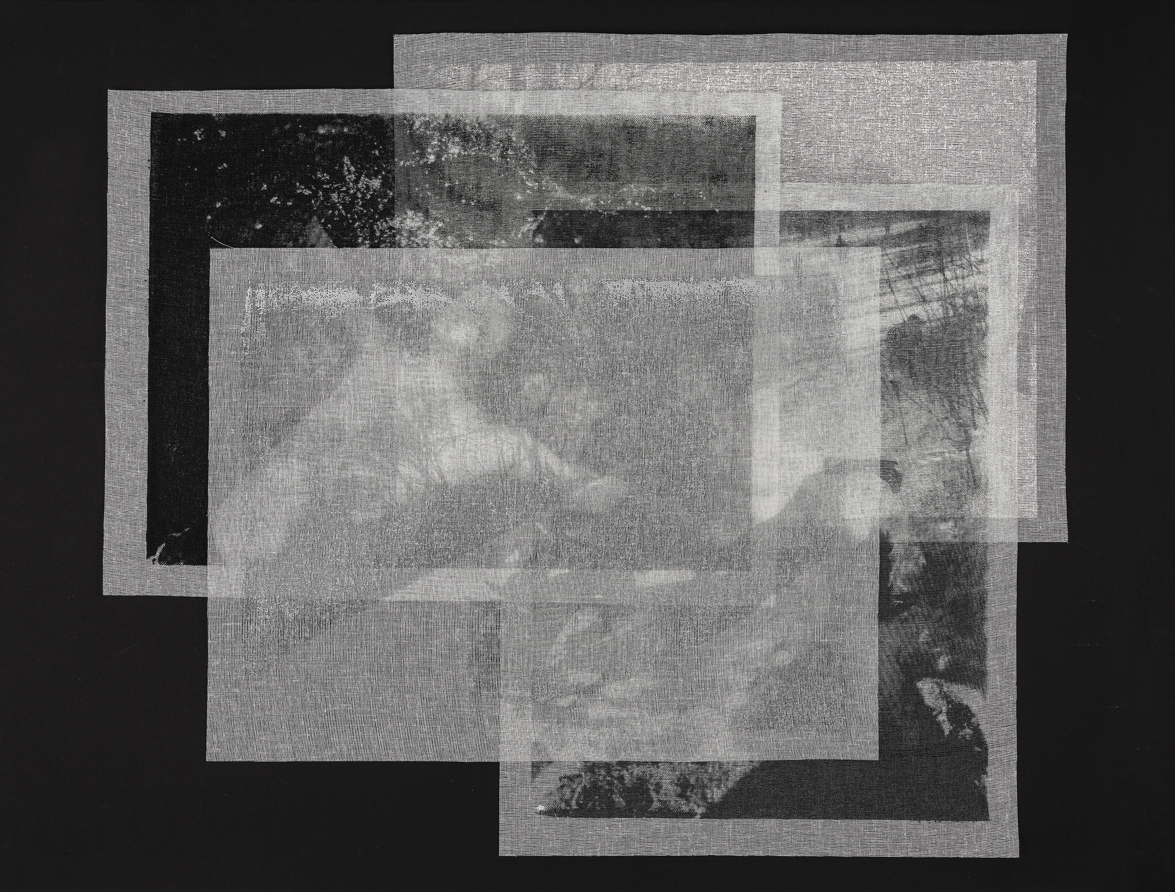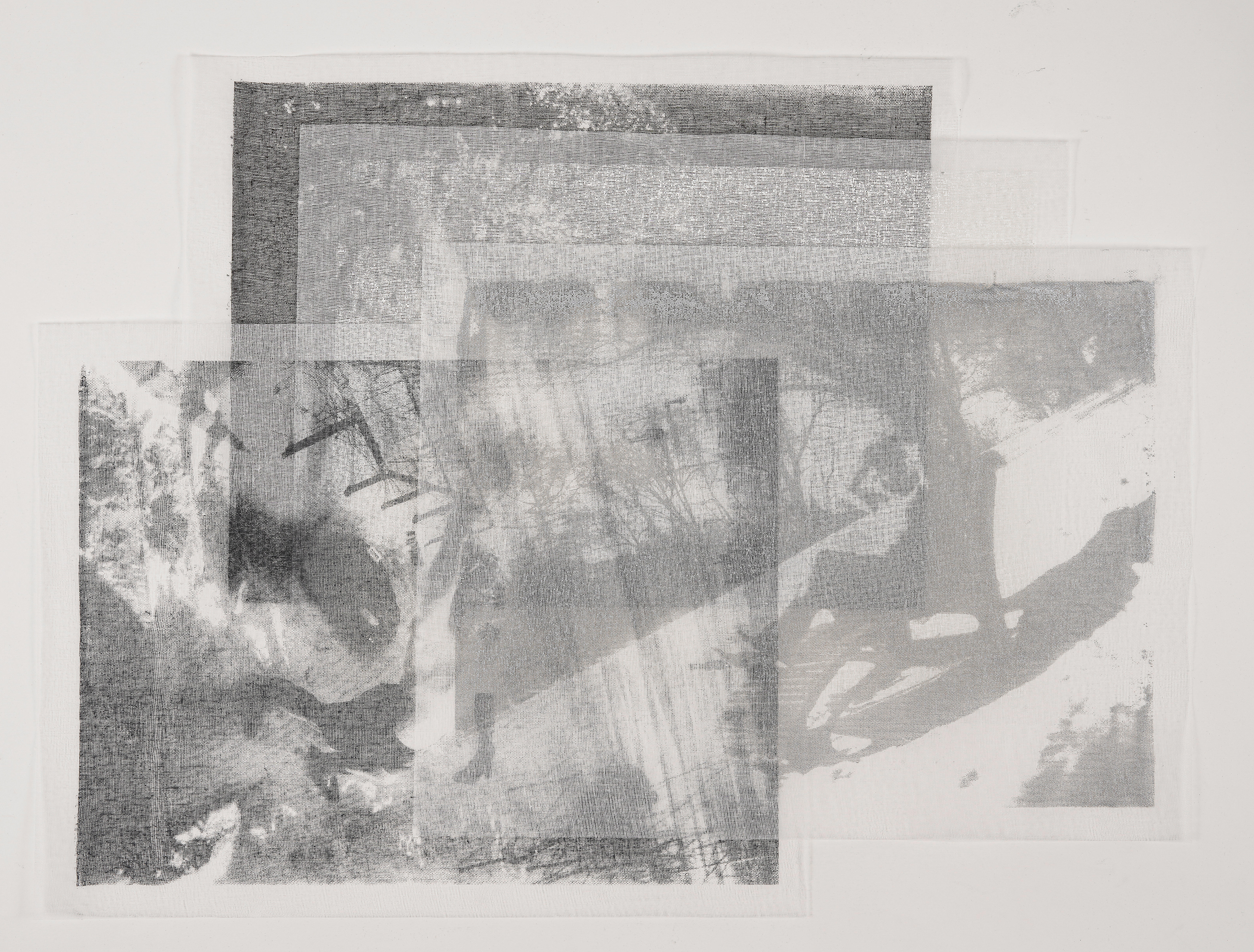 The piece translates these images through layers of tarlatan, a material traditionally used in printmaking to both remove and redistribute ink. Here, four suspended layers hold progressively darkened impressions of a photographic negative. The top layer, printed in white, a breath against snow, while each subsequent layer accumulates density, shadow, and weight.