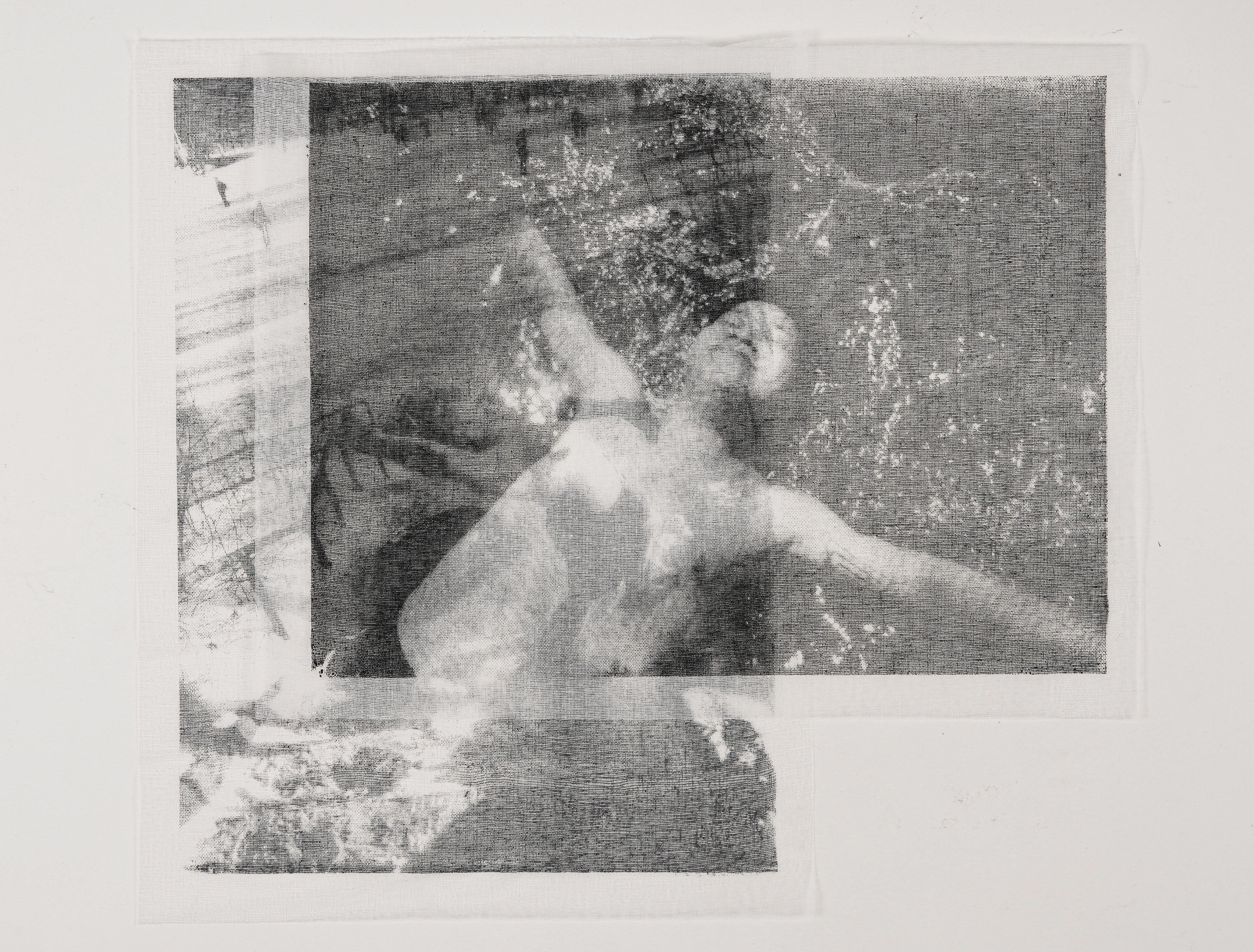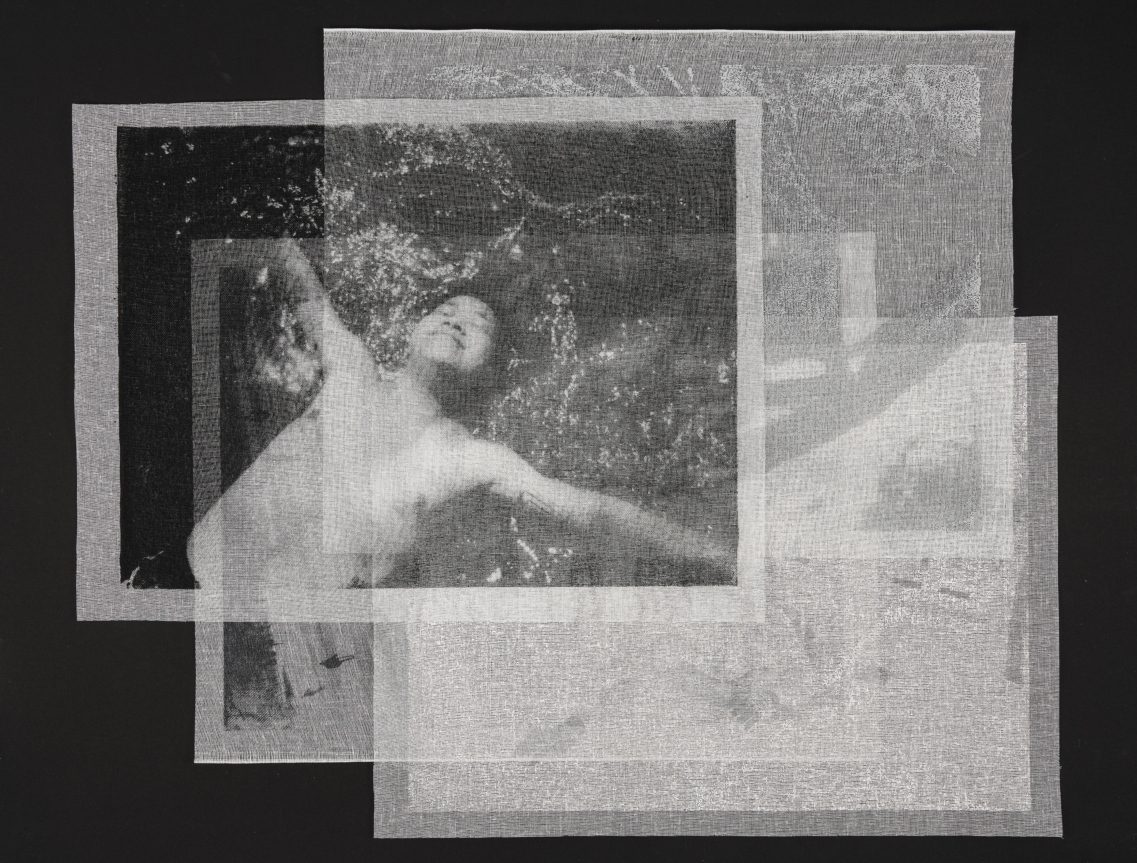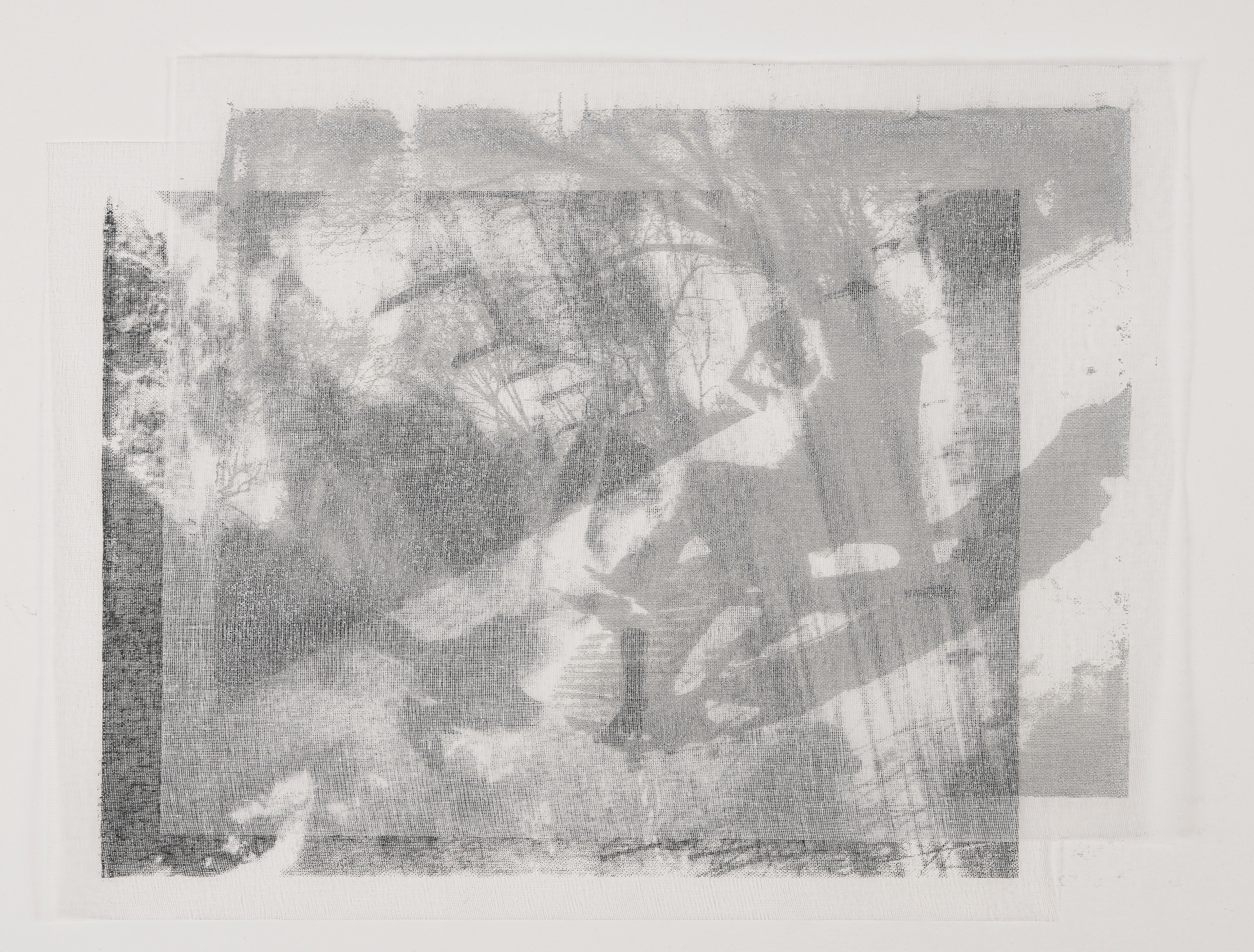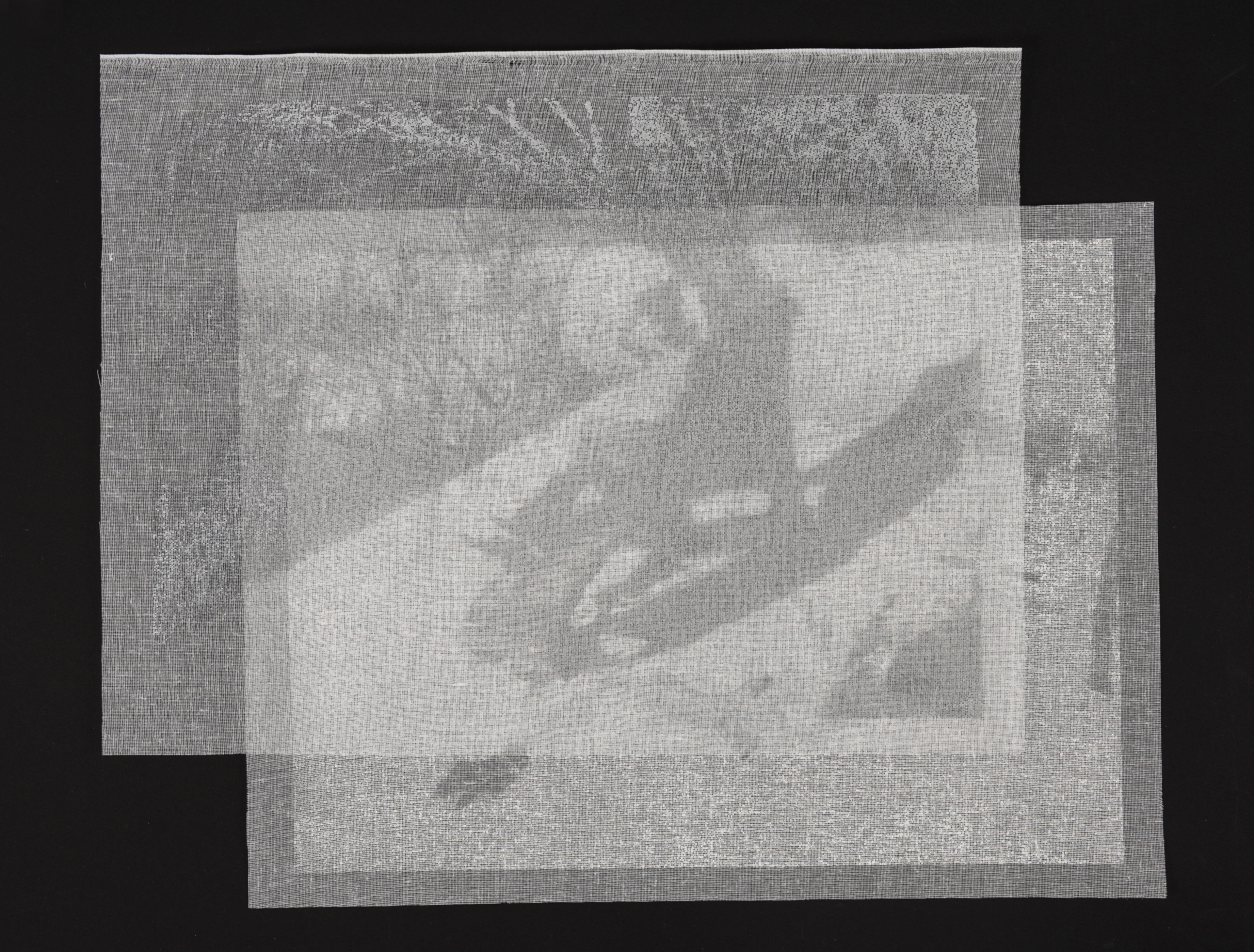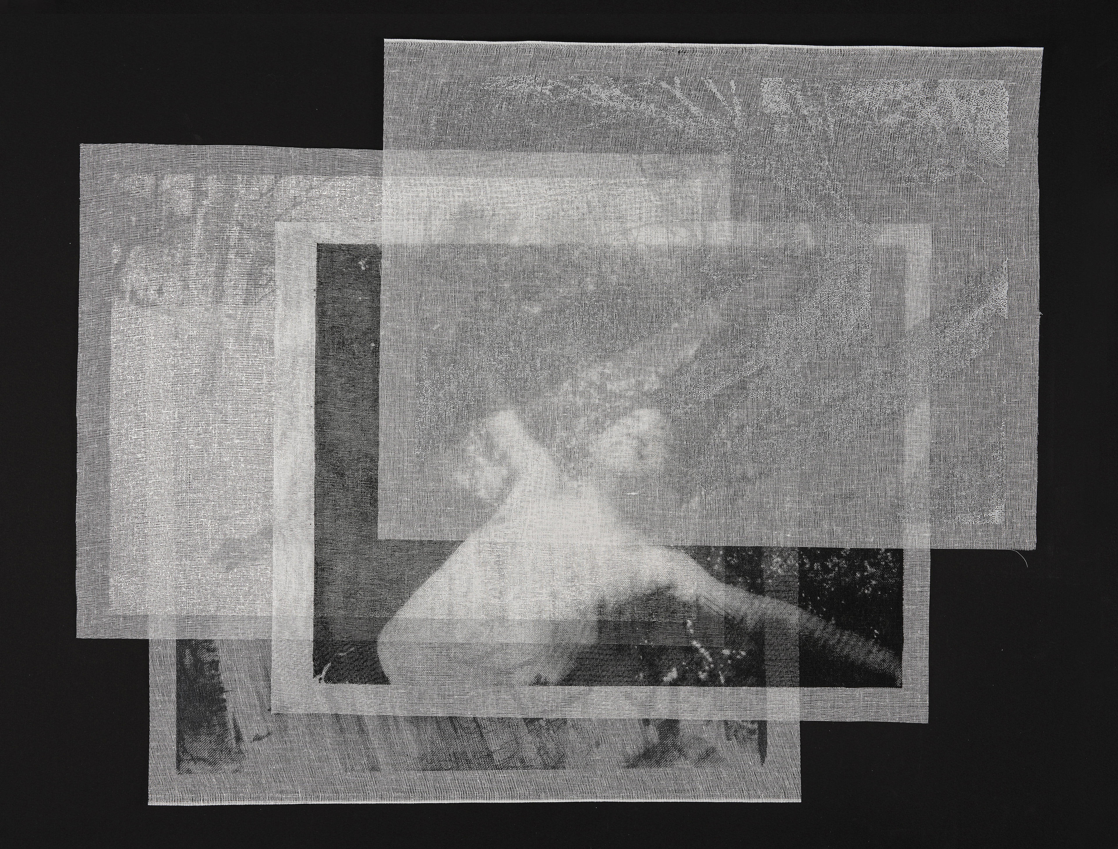The piece translates these images through layers of tarlatan, a material traditionally used in printmaking to both remove and redistribute ink. Here, four suspended layers hold progressively darkened impressions of a photographic negative. The top layer, printed in white, a breath against snow, while each subsequent layer accumulates density, shadow, and weight.