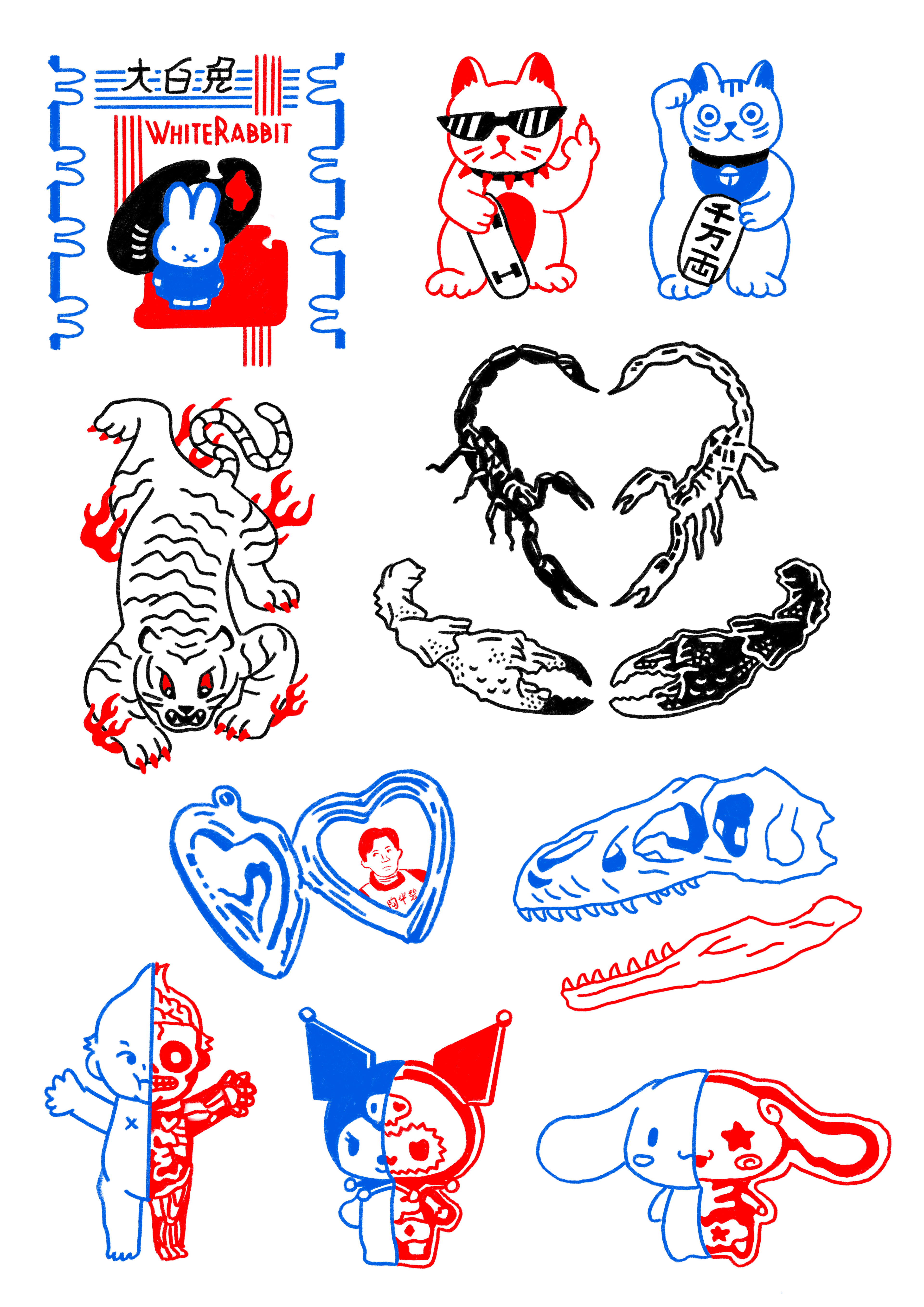 In my tattoo practice, I often work with Chinese and Japanese illustrations, 60s Shanghai animation, Edo/Meiji woodblock prints, images, textures and patterns in my daily life. I also do printmaking, so I like to incorporate a variety of mixed influences.
